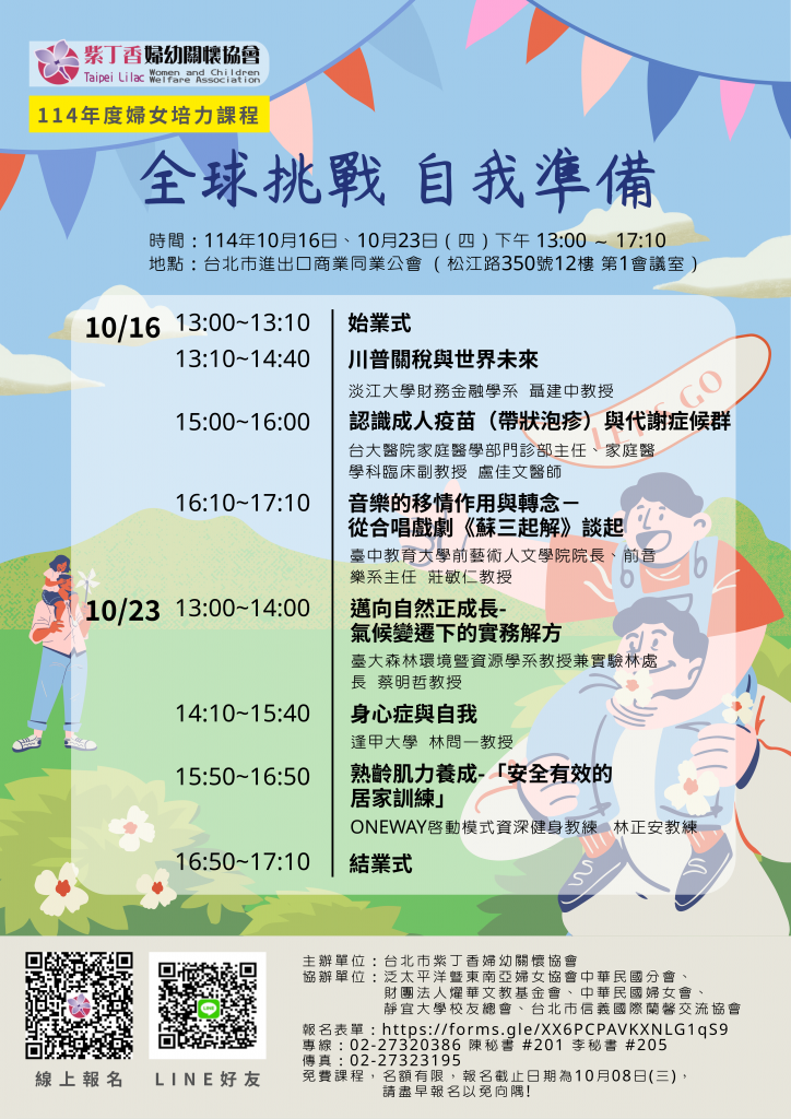 本次課程透過多元主題和實踐,關注國際趨勢與社會變遷,提升環境永續與社會適應力。課程涵蓋全球脈動、自我關照等核心觀念,結合環境永續、社會適應等提升婦女的多元知能。課程並且包含心流體驗、自我關照幫助現代婦女學習醫學新知,守護自己與照護家人的健康。