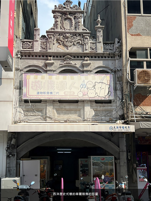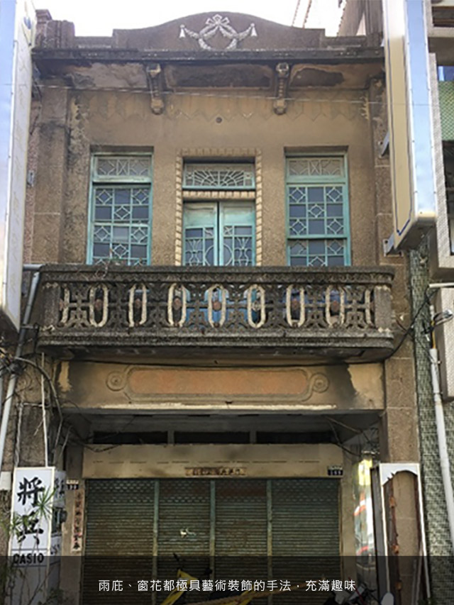 其中有一幢二樓以上立面仍保有西洋歷史式樣的華麗裝飾,建物在對稱的基調下,有著豐富的花草、貝殼裝飾,其中也有象徵日本皇室的菊花,頂端中央則是常見的鮑魚飾,可說是蔣公路開通於大正年間的最佳證明。