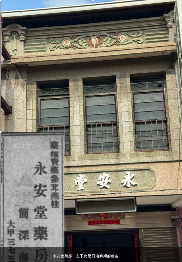 永安堂位於現在的順天路173號,這家從日治時期就開業的中藥鋪,創業主人簡深海,基於永續經營的壯志,就把自家的姓氏放在二樓女兒牆的中央,四週以薄荷綠、粉桔黃與糙米白的花卉、藤蔓圈拱圍繞,堪稱整條街上最吸睛的招牌,想必也是當年最佳的廣告手法。